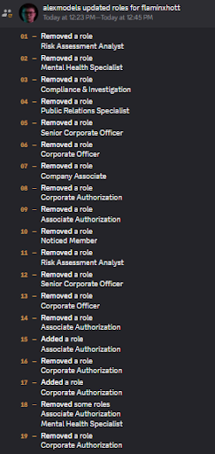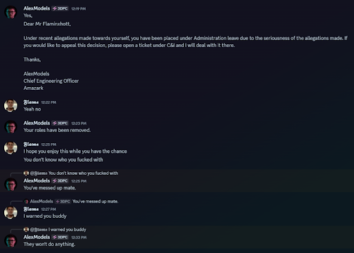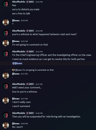 Alex supposedly was “investigating” the matter between users , to which he questioned Flame, and when Flame refused to answer his questions, Flame was stripped of his roles for “impending an investigation”, in which Alex has no jurisdiction to do so.