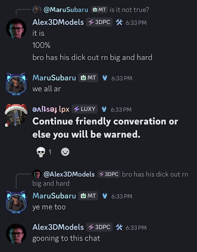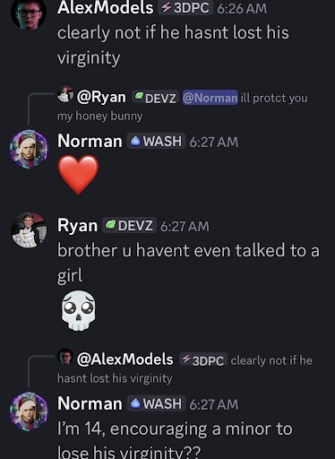 Below, sexual and inappropriate conduct is represented. This is a gross misrepresentation of our Corporation to the users that reside within the community. User was initially removed from roles but was reinstated shortly after due to this behavior.