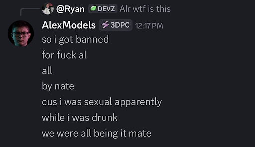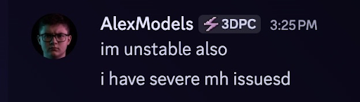 User has stated before they face mental issues that affect their stableness. This is a big red flag, as users in leadership and executive should be stable and reliable at all times. His behavior in the server also very clearly demonstrates lack of behavioral control, easily losing temper, professionalism, and mannerisms in a moments notice. Some can even be practically unprompted. There is a lack of images due to the high volume of representation in his chats on a day to day basis.